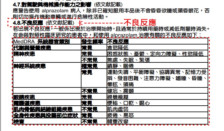 下方的「4.8 不良反應」有一整個表格。
